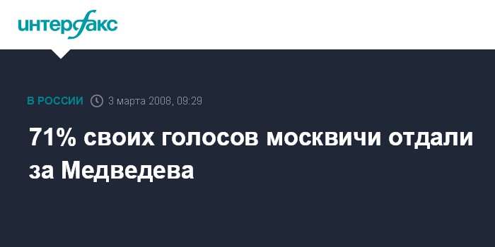 3 марта. INTERFAX.RU - После подсчета 95,37% протоколов московских участковых избирательных комиссий Дмитрий Медведев набирает 71,6% голосов, сообщили "Интерфаксу" в Мосгоризбиркоме.