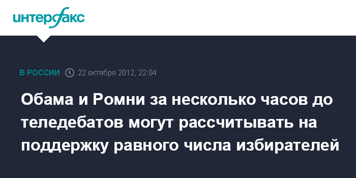 Вашингтон. 22 октября. INTERFX.RU - Действующий президент США Барак Обама и его соперник на выборах - республиканец Митт Ромни - в настоящее время пользуются равной поддержкой у избирателей, говорится в опубликованном в понедельник опросе компании Ipsos.