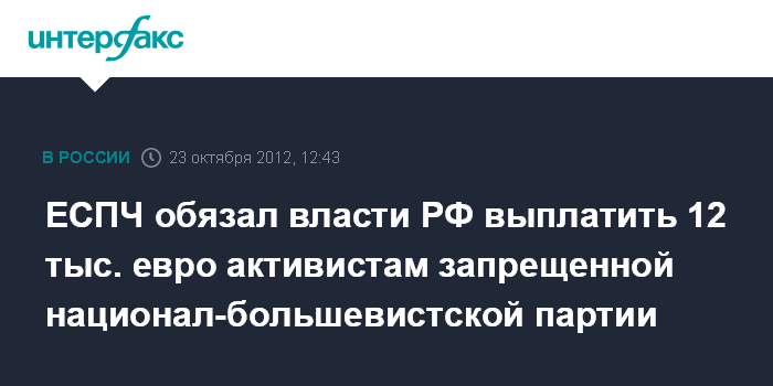 Страсбург. 23 октября. INTERFAX.RU - Европейский суд по правам человека постановил взыскать с властей РФ 12 тыс. евро по иску активистов Алексея Зенцова, Лиры Гуськовой и Ивана Дроздова запрещенной национал-большевистской партии (НБП) против российских властей, говорится в пресс-релизе суда, опубликованном во вторник.