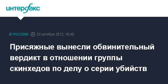 Москва. 23 октября. INTERFAX.RU - Присяжные в Мосгорсуде признали виновными в убийствах и покушении на убийство шестерых из семи обвиняемых по делу банды скинхедов.