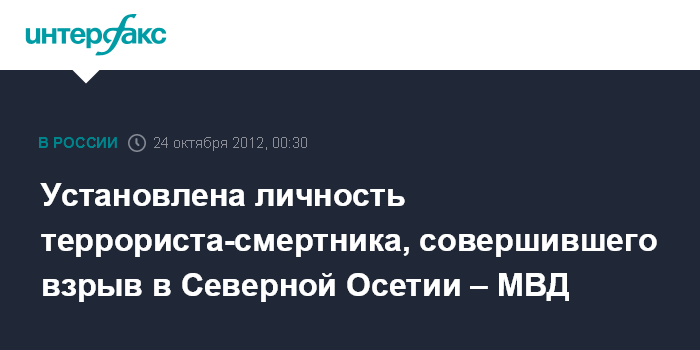 Владикавказ. 24 октября. ИНТЕРФАКС-ЮГ – Террористом-смертником, взорвавшим КПП-105 в селении Чермен Пригородного района Северной Осетии, оказался житель Ингушетии, сообщила агентству «Интерфакс – Юг» руководитель пресс-службы МВД по Северной Осетии Алла Ахполова.