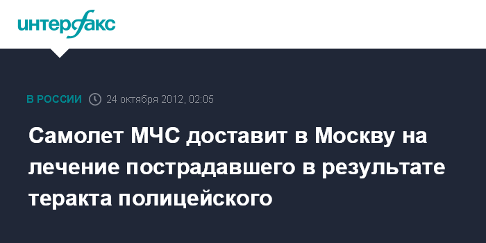 Москва. 24 октября. ИНТЕРФАКС - Самолет МЧС РФ с пострадавшим во время теракта полицейским вылетел из Владикавказа в Москву, сообщили "Интерфаксу" в управлении информации ведомства.
