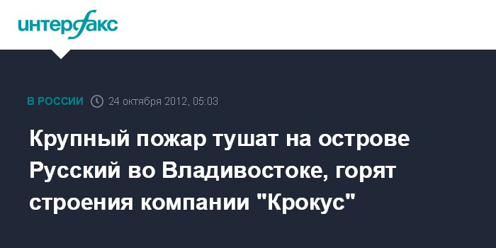 Владивосток. 24 октября. ИНТЕРФАКС - ДАЛЬНИЙ ВОСТОК - Крупный пожар вспыхнул на острове Русский - загорелись строения, принадлежащие компании "Крокус" - генеральному подрядчику строительства кампуса Дальневосточного федерального университета.