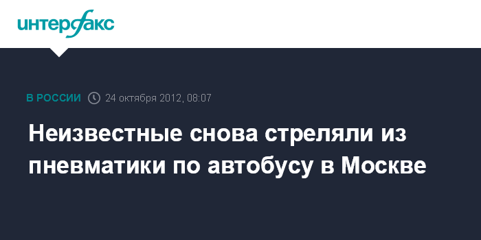 Москва. 24 октября. INTERFAX.RU - В Москве в очередной раз был обстрелян из пневматического пистолета автобус, сообщили "Интерфаксу" в пресс-службе ГУ МВД России по столице. "Вечером во вторник по адресу: ул. Борисовские пруды, д. 8 на проезжей части неизвестный из пневматического пистолета, из хулиганских побуждений, выстрелил несколько раз в боковое стекло автобуса "ЛиАЗ", следовавшего по маршруту N 742", - сказал сотрудник пресс-службы.