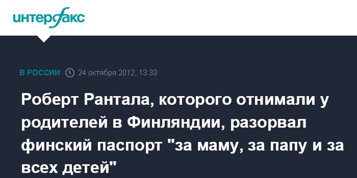 Инга Рантала вместе с сыном Робертом, которого органы соцопеки Финляндии забирали из семьи в приют, сделали заявление у входа в здание дипмиссии. Мальчик достал паспорт, раскрыл его на странице со своей фотографией и со слезами на глазах сказал, что Финляндия нарушила его права и права его родителей. "Я сделал свой выбор, хочу отказаться от финского паспорта и гражданства", - сказал Роберт, начав вырывать страницу за страницей. "Это за маму, это папу, это за меня, это за всех детей", - сопровождал комментариями он свое действия. Вырванные листы паспорта Рантала сложил вместе и бросил в сторону финского консульства.