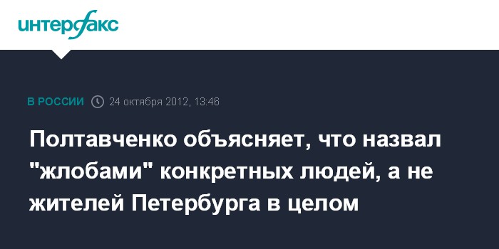 Санкт-Петербург.24 октября. INTERFAX.RU - Губернатор Петербурга Георгий Полтавченко пояснил, что комментируя ситуацию с проездом премьерского кортежа в телеинтервью, он употребил слово "жлоб" в отношении отдельных людей, не имея в виду население города в целом.