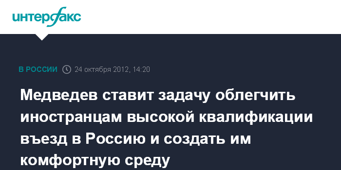 "Нам нужно действовать дальше в направлении упрощения процедур въезда иностранцев в нашу страну, особенно тех специалистов, которые прибывают к нам из других стран для работы по высококвалифицированным направлениям", - заявил Медведев на совещании по вопросу создания международного финансового центра в РФ.