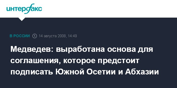 Москва. 14 августа. INTERFAX.RU - Россия будет настаивать на подписании юридически обязывающего соглашения после согласования с югоосетинской и абхазской сторонами принципов урегулирования конфликта, заявил президент РФ Дмитрий Медведев.