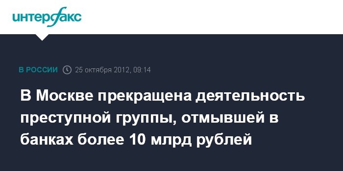Москва. 25 октября. INTERFAX.RU - В Москве разоблачена преступная группа, которая в результате незаконной банковской деятельности "отмыла" более 12 млрд рублей, сообщили "Интерфаксу" в управлении экономической безопасности и противодействия коррупции (УЭБиПК) ГУ МВД РФ по Москве.