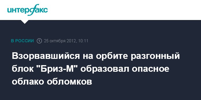 Москва. 25 октября. INTERFAX.RU - Взрыв разгонного блока "Бриз-М" на орбите привел к образованию "облака" космических обломков, исчисляющихся несколькими сотнями элементов, представляющих потенциальную угрозу Международной космической станции и аппаратам на низких круговых орбитах, сообщил "Интерфаксу" источник в ракетно-космической отрасли.