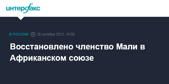 Аддис-Абеба. 25 октября. INTERFAX.RU - Африканский союз (АС) принял решение восстановить членство Мали в организации, приостановленное в марте этого года, заявил комиссар по миру и безопасности АС Рамтан Ламамра после заседания Совета безопасности и мира организации.