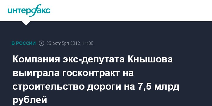 Москва. 25 октября. INTERFAX.RU - Сложившему полномочия депутата Госдумы единороссу Алексею Кнышову есть чем заняться: его компания "Донаэродорстрой" выиграла контракт на 7,5 млрд рублей на строительство дороги, сообщает газета "Ведомости" в четверг.