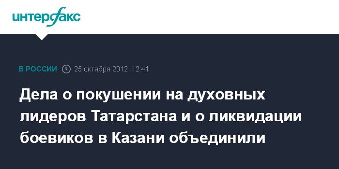 Москва. 25 октября. INTERFAX.RU - Уголовные дела, возбужденные по фактам покушения на духовных лидеров Татарстана, а также уничтожения двух боевиков в Казани, объединены в одно производство, сообщил "Интерфаксу" официальный представитель СК РФ Владимир Маркин.