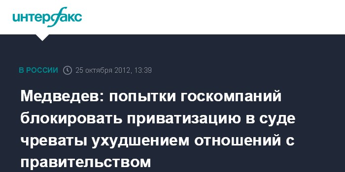 Москва. 25 октября. INTERFAX.RU - Попытки госкомпаний блокировать приватизационные сделки посредством судебных процедур чревато для их руководства ухудшением отношений с правительством, предупредил премьер-министр Дмитрий Медведев.