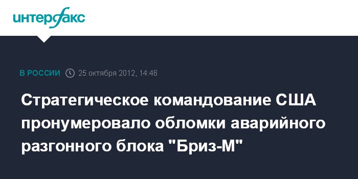 Москва. 25 октября. INTERFAX.RU - Обломки взорвавшегося российского разгонного блока "Бриз М" взяты под контроль стратегическим командованием США, говорится в информации на сайте ведомства.