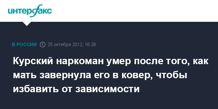 Курск. 25 октября. INTERFAX.RU - Житель Курска умер в ковре, куда его закатала мать, чтобы оградить от употребления наркотиков, сообщает следственное управление СКР по Курской области в четверг. Сообщение о смерти 29 летнего местного жителя поступило в отдел полиции 21 октября текущего года от его матери.