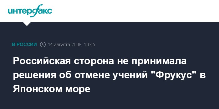Москва. 14 августа. INTERFAX.RU - Россия на данный момент не отказывается от проведения военно-морских учений "Фрукус-2008" в Японском море, заявил заместитель начальника Генштаба Вооруженных сил РФ Анатолий Ноговицын.