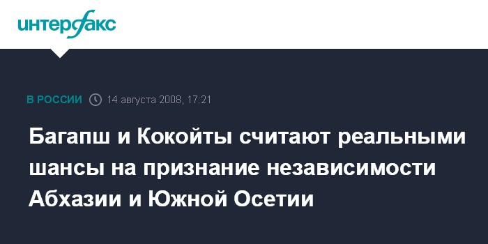 Москва. 14 августа. INTERFAX.RU - Президенты Южной Осетии и Абхазии Эдуард Кокойты и Сергей Багапш расценивают как вполне реальные шансы своих республик на признание их независимости.