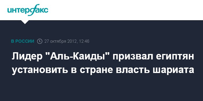 Вашингтон. 27 октября. INTERFAX.RU - Главарь террористической организации "Аль-Каида" Айман аз-Завахири призвал мусульман похищать выходцев из западных стран и заявил, что египтяне должны возобновить революцию и установить в стране власть шариата, сообщает в субботу сервис SITE, занимающийся мониторингом экстремистских сайтов.