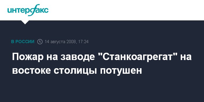 Москва. 14 августа. INTERFAX.RU - Сильный пожар, который возник в четверг днем на территории завода "Станкоагрегат" в Восточном административном округе столицы, потушен, сообщил "Интерфаксу" источник в правоохранительных органах. "После 19 сбросов воды с вертолетов пожар в 17:15 ликвидирован", - сказал собеседник агентства. По его данным, площадь пожара составила 1200 кв. метров, пострадавших нет.