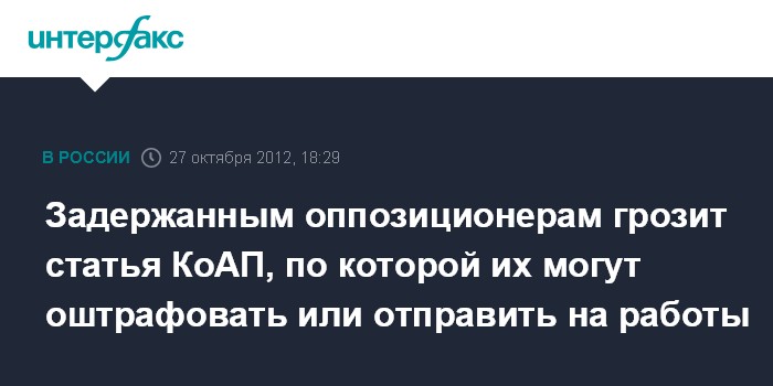 Москва. 27 октября. INTERFAX.RU - Задержанным в субботу на несанкционированной акции оппозиционерам грозит крупный штраф или обязательные работы. "Оформляют ст. 20.2 КоАП РФ (нарушение порядка организации массовой акции)", - сообщил в субботу в "Твиттере" один из задержанных Илья Яшин.