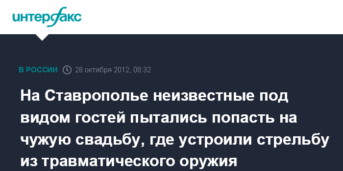 "Инцидент произошел в субботу днем. Трое неизвестных зашли в кафе в Нефтекумске, где в это время гуляла свадьба, и попыталась присоединиться к гостям. Однако ни одна из гуляющих сторон их в качестве приглашенных не опознала. На предложение покинуть свадьбу неизвестные достали травматическое оружие и попытались открыть стрельбу. Один из них ранил себя в ногу. После чего совместными усилиями гостей хулиганы были выдворены со свадебного торжества. В этот момент уже прибыли сотрудники полиции, которые и задержали незваных гостей", - сказал собеседник агентства.