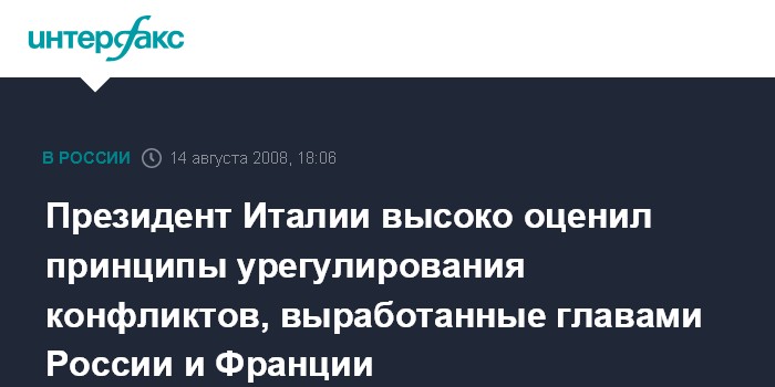 Наполитано дал высокую оценку принципам урегулирования конфликтов, выработанным и согласованным президентами России и Франции 12 августа в Москве, отметив их поддержку в целом на встрече министров иностранных дел ЕС.