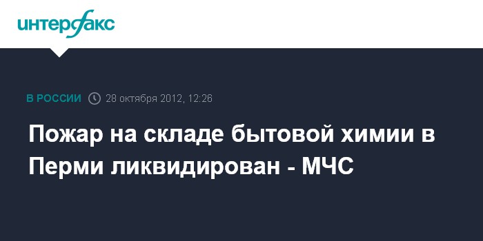 Пермь. 29 октября. INTERFAX.RU - Пожарные потушили возгорание на складе бытовой химии в Перми, сообщил агентству "Интерфакс-Поволжье" представитель ГУ МЧС по Пермскому краю.