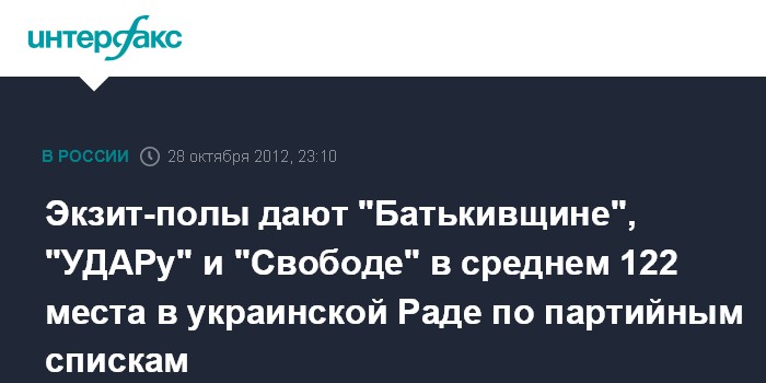 Киев. 28 октября. ИНТЕРФАКС-УКРАИНА - Оппозиционные партии "Батькивщина", "УДАР" и "Свобода" совместно получают от 117 до 127 мест в новой Верховной Раде Украины по партийным спискам. Таковы результаты пяти экзит-полов, оглашенных по итогам парламентских выборов.