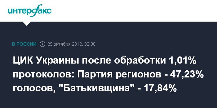 Киев. 28 октября. ИНТЕРФАКС-УКРАИНА - Согласно результатам обработки 1,01% протоколов на парламентских выборах на Украине, Партия регионов набрала 47,23% голосов, "Батькивщина" - 17,84%, КПУ - 14,99%, "УДАР" - 8,95%, "Свобода" - 4,15%.