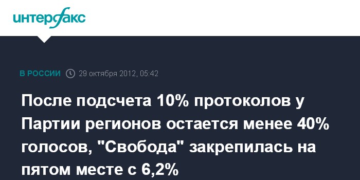 Киев. 28 октября. ИНТЕРФАКС-УКРАИНА - Согласно результатам обработки 10,18% протоколов на парламентских выборах в Украине по партийным спискам, Партия регионов набирает 39,87% голосов, "Батькивщина" - 19,61%, КПУ - 15,8%, "УДАР" - 11,6%, "Свобода" - 6,21%.