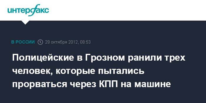 Москва. 29 октября. INTERFAX.RU - На окраине поселка Старая Сунжа в Грозном водитель автомобиля попытался совершить наезд на постового КПП, в ответ сотрудники полиции ранили владельца и двух пассажиров машины, сообщил "Интерфаксу" в понедельник источник в правоохранительных органах.