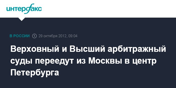 Москва. 29 октября. INTERFAX.RU - Верховный и Высший арбитражный суд (ВС и ВАС), которые по инициативе премьера РФ Дмитрия Медведева должны быть выведены из старой Москвы, вероятно, будут размещены не в Москве "новой", а в центре Санкт-Петербурга, недалеко от переехавшего туда в 2008 году Конституционного суда, пишет газета "Коммерсант" в понедельник.