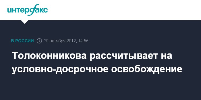 Нижний Новгород. 29 октября. INTERFAX.RU - Осужденная участница панк-группы Pussy Riot Надежда Толоконникова, находящаяся в колонии N14 в Мордовии, может в марте подать ходатайство об условно-досрочном освобождении.