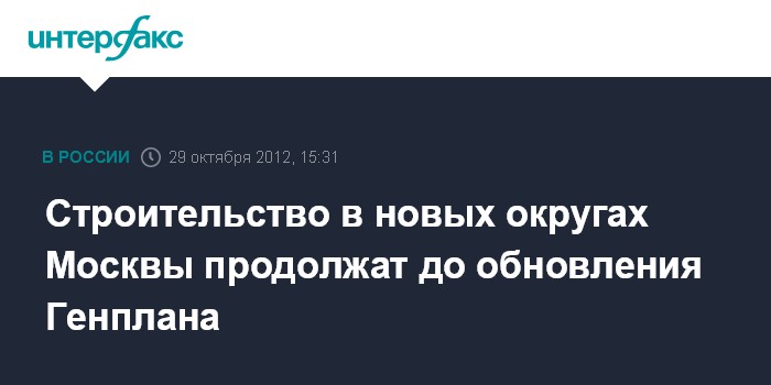 Москва. 29 октября. INTERFAX.RU - Строительство на присоединенных к Москве территориях продолжится до корректировки Генплана, сообщили в пресс-службе столичного комитета государственного строительного надзора.
