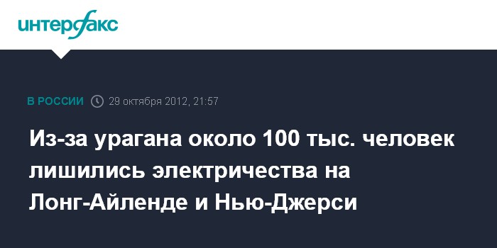 Вашингтон. 29 октября. INTERFAX.RU - Не менее 54 тыс. потребителей остались без электрообеспечения на острове Лонг-Айленд (штат Нью-Йорк), еще более 42 тыс. в американском штате Нью-Джерси сообщают в понедельник энергетические компании, обсуживающие эти районы США.