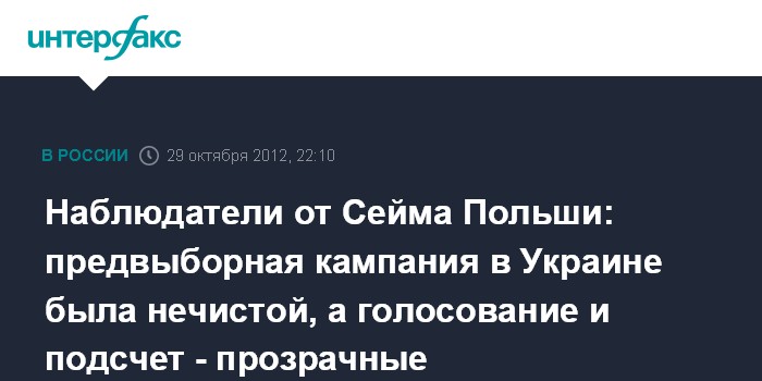 Киев. 29 октября. INTERFAX.RU - В миссии наблюдателей от польского Сейма отмечают прозрачность избирательной кампании в день голосования, однако называют предвыборную кампанию нечистой.