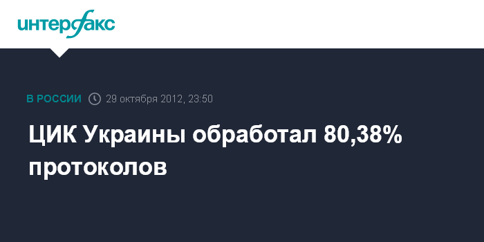 Киев. 29 октября. INTEAX.RU - Согласно результатам 80,38% обработанных протоколов на парламентских выборах в Украине, Партия регионов набрала 32,40%, "Батькивщина" - 23,73%, КПУ - 14,11%, "УДАР" - 13,34%, "Свобода" - 9,43%.