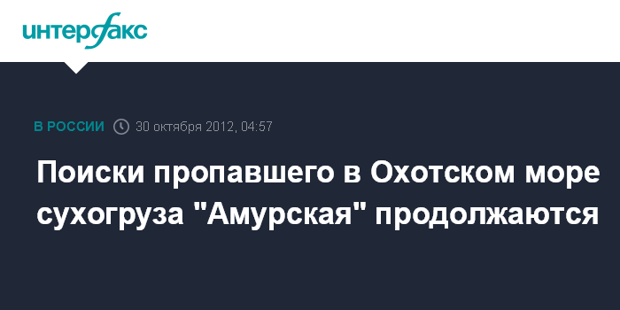 Южно-Сахалинск. 30 октября. ИНТЕРФАКС - ДАЛЬНИЙ ВОСТОК - Поиски пропавшего в Охотском море сухогруза "Амурская" пока осуществляет только танкер "Новик", два рыболовецких траулера пережидают штормовую погоду в закрытых бухтах, сообщили агентству "Интерфакс - Дальний Восток"в морском спасательном подцентре МСПЦ "Южно-Сахалинск".