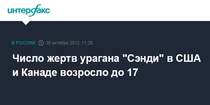 Вашингтон. 30 октября. INTERFAX.RU - Не менее 17 человек погибли в США и Канаде из-за урагана "Сэнди", сообщают во вторник американские СМИ. Так, 16 человек погибли в штатах Нью-Йорк, Нью-Джерси, Пенсильвания, Северная Каролина, Западная Вирджиния, Коннектикут и Мэриленд. Еще один человек погиб в канадском городе Торонто.