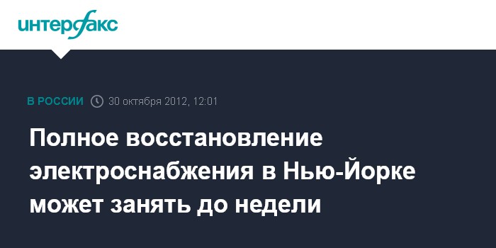 Вашингтон. 30 октября. INTERFAX.RU - На окончательное восстановление подачи электричества, отключенной в связи со взрывом на нью-йоркской электростанции Consolidated Edison на востоке Манхэттена, может уйти вплоть до недели, хотя, возможно, потребуется и меньше времени, заявил во вторник вице-президент электростанции Джон Миксэд.