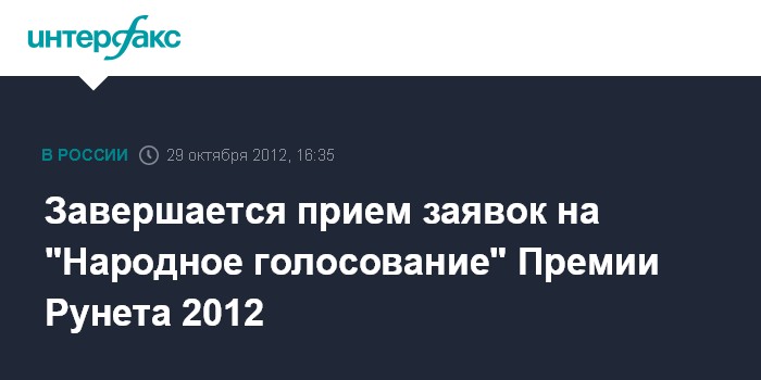 Москва. 29 октября. INTERFAX.RU - Прием заявлений на соискание Национальной премии за вклад в развитие российского сегмента сети Интернет "Премия Рунета 2012" в номинации "Народное голосование" завершается 31 октября .