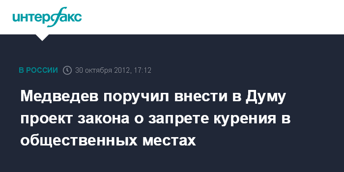 Москва. 30 октября. INTERFAX.RU - Премьер-министр Дмитрий Медведев распорядился внести в Госдуму законопроект о запрете курения в общественных местах.