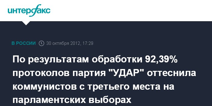 По результатам обработки 92,39% протоколов партия "УДАР" оттеснила коммунистов с третьего места на парламентских выборах