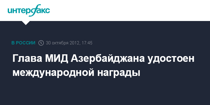Баку. 30 октября. INTERFAX.RU - Министр иностранных дел Азербайджана Эльмар Мамедъяров удостоен награды "Позитивная личность 2011 года в сфере внешней политики", сообщает пресс-служба МИД.