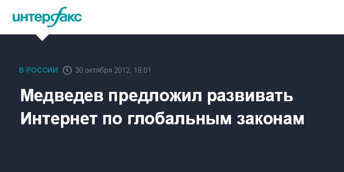 Пермь. 30 октября. INTERFAX.RU - Премьер-министр РФ Дмитрий Медведев предлагает выработать единые мировые правила работы в интернете, при этом он заметил, что некоторые страны не хотят в этом участвовать.