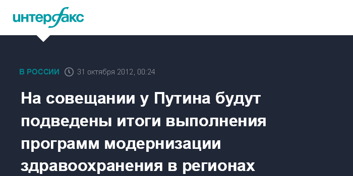 Москва. 31 октября. ИНТЕРФАКС - Президент России Владимир Путин в среду проведет совещание по вопросу "О реализации региональных программ модернизации здравоохранения в 2011-2012 гг.".