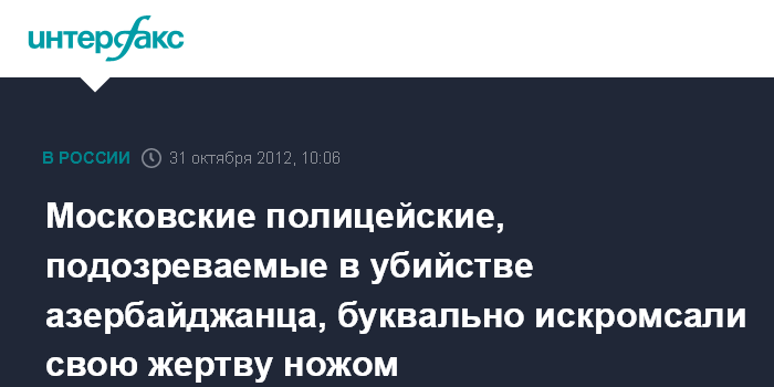 Москва. 31 октября. INTERFAX.RU - Подозреваемые в убийстве азербайджанца сотрудники московской полиции во время убийства нанесли потерпевшему почти 80 ударов ножом, сообщил "Интерфаксу" официальный представитель СК РФ Владимир Маркин.
