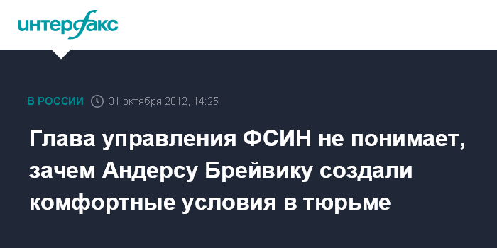 Москва. 31 октября. ИНТЕРФАКС - В Федеральной службе исполнения наказаний (ФСИН) РФ считают излишеством комфортные условия для осужденных за тяжкие преступления, аналогичные тем, в которых содержится норвежский террорист Андерс Брейвик.