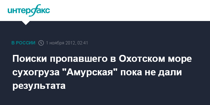 Южно-Сахалинск. 1 ноября. ИНТЕРФАКС-ДАЛЬНИЙ ВОСТОК - Поиски пропавшего сухогруза "Амурская" в Охотском море продолжает танкер "Новик", к району поиска идет спасательный буксир "Рубин" СахБАСУ, прибытие которого туда ожидается 3 ноября, сообщили агентству "Интерфакс - Дальний Восток" в четверг в морском спасательном подцентре МСПЦ "Южно-Сахалинск".